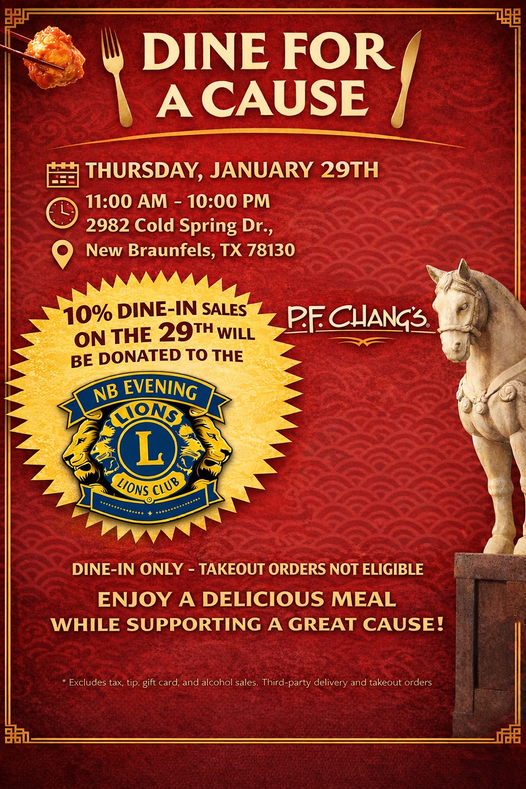 We are partnering with P. F. Chang’s in New Braunfels to have fund raiser for our club on